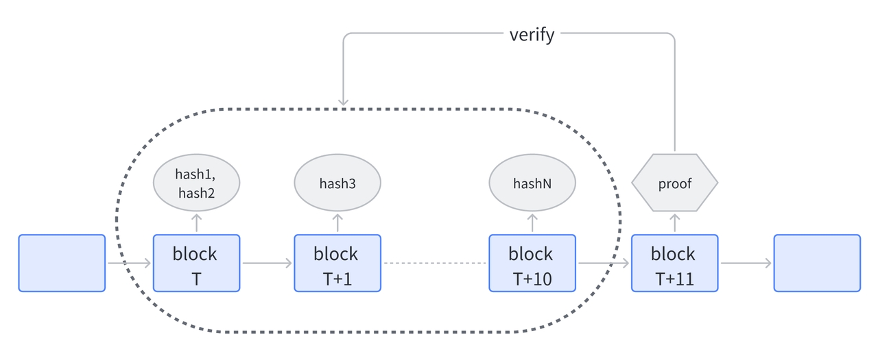 After the T+11th block, any prover can submit a ZKP. As long as one ZKP passes verification, it can be used to verify all the submitted hashes. Validated provers receive PoW rewards based on the ratio of miners' staked amounts.
